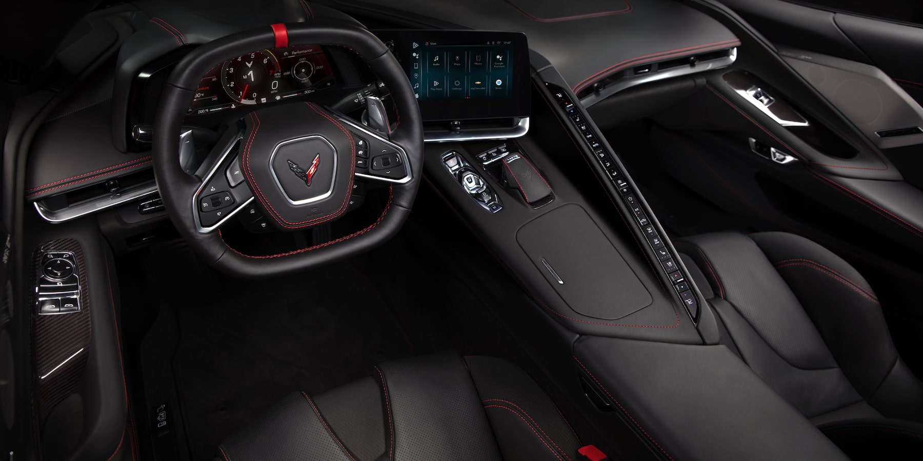 Inside, the new Chevy Corvette Stingray's fighter-jet-inspired cockpit has controls and panels that are arrayed to surround the driver. Its power-adjustable front seats are covered in genuine leather upholstery. A squared-off, leather-wrapped steering wheel is also power-adjustable to help you get ideal positioning. The Corvette Stingray has 12.9 cubic feet of space to stow your belongings between its front and rear trunks.