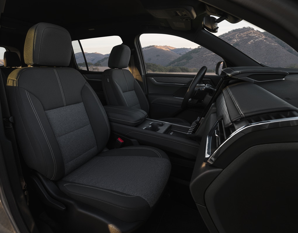 The GMC Acadia spreads a modern set of comfort and convenience offerings across its trims (Elevation, AT4, and Limited). The base Elevation offers heated front seats, tri-zone automatic climate control, a heated steering wheel, and remote engine start. Jumping to the AT4 trim assures cloth seat inserts while the Denali trim offers leather upholstery, ventilated front seats, heated second-row seats, a power adjustable steering wheel, and driver's seat with memory settings. Near-luxury features can be had via packages like the Black Edition package, Luxury package, and Denali Reserve package.