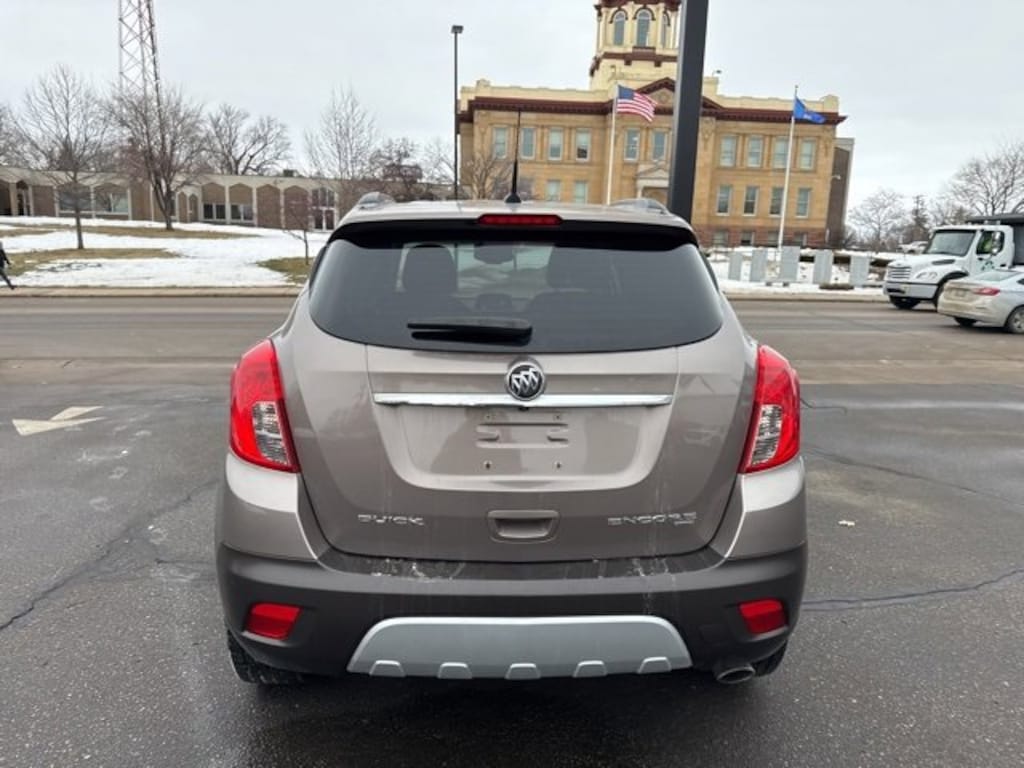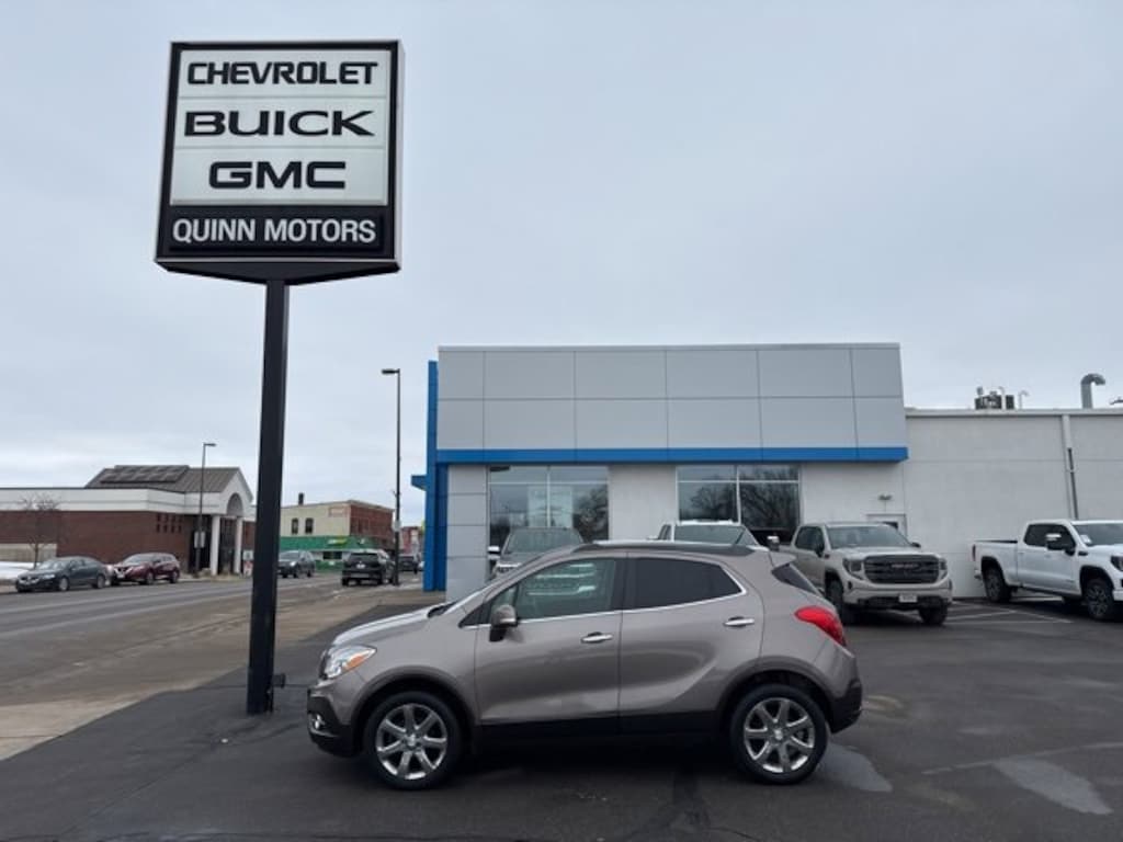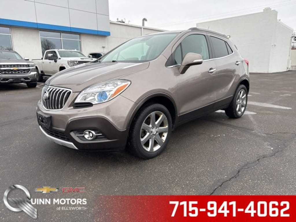 Quinn Motors of Ellsworth is very proud to offer this fantastic-looking 2014 Buick Encore Leather in Cocoa Silver Metallic, beautifully equipped with 1SL Equipment Group (120-Volt Power Outlet, Auto-Dimming Inside Rear-View Mirror, Dual-Zone Automatic Climate Control, Front Fog Lamps, and Remote Vehicle Starter System), Encore Leather, 4D Sport Utility, ECOTEC 1.4L I4 SMPI DOHC Turbocharged VVT, 6-Speed Automatic, AWD, Cocoa Silver Metallic, Ebony Leather, Premium audio system: IntelliLink, 18 Chromed Aluminum Wheels, 3.53 Final Drive Ratio, 4-Wheel Disc Brakes, 6 Speakers, ABS brakes, Air Conditioning, Alloy wheels, AM/FM radio: SiriusXM, Auto-dimming Rear-View mirror, Automatic temperature control, Brake assist, Bumpers: body-color, CD player, Compass, Delay-off headlights, Driver door bin, Driver vanity mirror, Driver's Seat Mounted Armrest, Dual front impact airbags, Dual front side impact airbags, Electronic Stability Control, Emergency communication system: OnStar Directions & Connections, Exterior Parking Camera Rear, Front anti-roll bar, Front Bucket Seats, Front dual zone A/C, Front fog lights, Front License Plate Bracket, Front reading lights, Front wheel independent suspension, Fully automatic headlights, Heated door mirrors, Heated Driver & Front Passenger Seats, Heated front seats, Heated steering wheel, Illuminated entry, Knee airbag, Leather steering wheel, Leather-Appointed Seat Trim, Low tire pressure warning, Memory seat, Occupant sensing airbag, Outside temperature display, Overhead airbag, Panic alarm, Passenger door bin, Passenger vanity mirror, Power door mirrors, Power driver seat, Power passenger seat, Power steering, Power windows, Radio data system, Radio: AM/FM Audio System w/MP3 CD Player, Rear seat center armrest, Rear side impact airbag, Rear window defroster, Rear window wiper, Remote keyless entry, Ride & Handling Suspension, Roof rack: rails only, Security system, SiriusXM Satellite Radio, Speed control, Speed-sensing steering, Split folding rear seat, Spoiler, Steering wheel mounted audio controls, Tachometer, Telescoping steering wheel, Tilt steering wheel, Traction control, Trip computer, Turn signal indicator mirrors, Variably intermittent wipers, and Wheels: 18 Painted Cast Aluminum. ** NON SMOKER**, ** Leather Heated Seats**, Encore Leather, 4D Sport Utility, ECOTEC 1.4L I4 SMPI DOHC Turbocharged VVT, 6-Speed Automatic, AWD, Cocoa Silver Metallic, Ebony Leather, 120-Volt Power Outlet, 1SL Equipment Group, Auto-Dimming Inside Rear-View Mirror, Dual-Zone Automatic Climate Control, Front Fog Lamps, Premium audio system: IntelliLink, Remote Vehicle Starter System. Priced below KBB Fair Purchase Price! Odometer is 15805 miles below market average! 23/30 City/Highway MPG