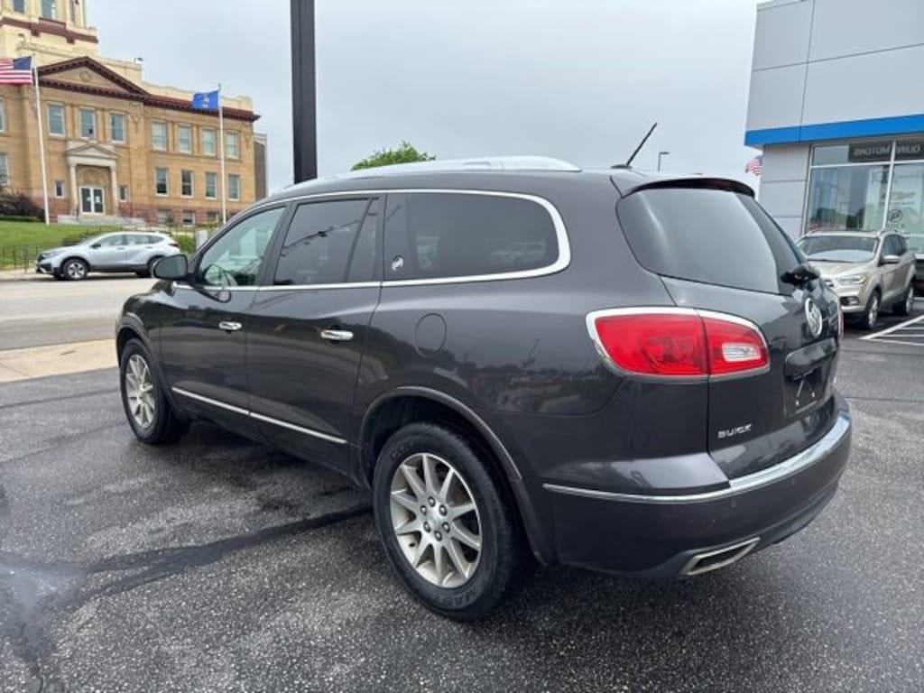 Quinn Motors of Ellsworth is excited to offer this beautiful-looking 2015 Buick Enclave Leather Group in Iridium Metallic, beautifully equipped with Preferred Equipment Group 1SL, AWD, 19 x 7.5 Aluminum (4) Wheels, 3.16 Axle Ratio, 3rd row seats: split-bench, 4-Wheel Disc Brakes, 6 Speakers, 7-Passenger Seating, ABS brakes, Air Conditioning, Alloy wheels, AM/FM radio: SiriusXM, Auto-dimming Rear-View mirror, Automatic temperature control, Brake assist, Bumpers: body-color, CD player, Compass, Delay-off headlights, Driver door bin, Driver vanity mirror, Dual front impact airbags, Dual front side impact airbags, Electronic Stability Control, Emergency communication system: OnStar Directions & Connections, Exterior Parking Camera Rear, Four wheel independent suspension, Front anti-roll bar, Front Bucket Seats, Front Center Armrest w/Storage, Front dual zone A/C, Front License Plate Mounting Bracket, Front reading lights, Fully automatic headlights, Garage door transmitter, Heated door mirrors, Heated front seats, Heated steering wheel, High intensity discharge headlights: Bi-Xenon, Illuminated entry, Leather steering wheel, Low tire pressure warning, Memory seat, Occupant sensing airbag, Outside temperature display, Overhead airbag, Panic alarm, Passenger door bin, Passenger vanity mirror, Perforated Leather-Appointed Seat Trim, Power door mirrors, Power driver seat, Power Liftgate, Power passenger seat, Power steering, Power windows, Radio data system, Radio: Color Touch AM/FM/CD w/IntelliLink, Rear air conditioning, Rear anti-roll bar, Rear Parking Sensors, Rear reading lights, Rear window defroster, Rear window wiper, Remote keyless entry, Roof rack: rails only, Security system, SiriusXM Satellite Radio, Speed control, Speed-sensing steering, Spoiler, Steering wheel mounted audio controls, Tachometer, Telescoping steering wheel, Tilt steering wheel, Traction control, Trip computer, Turn signal indicator mirrors, Variably intermittent wipers, and Voltmeter. AWD.