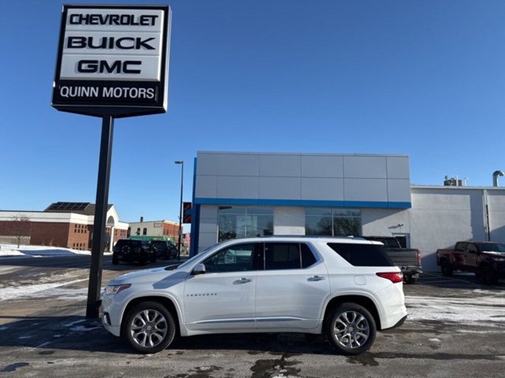 Quinn Motors of Ellsworth is pumped up to offer this charming 2021 Chevrolet Traverse Premier in Iridescent Pearl Tricoat, beautifully equipped with Front License Plate Bracket Mounting Package, Preferred Equipment Group 1LZ, AWD, 10 Speakers, 3.49 Axle Ratio, 3rd row seats: split-bench, 4-Wheel Disc Brakes, 7-Passenger Seating (2-2-3 Seating Configuration), ABS brakes, Air Conditioning, Alloy wheels, AM/FM radio: SiriusXM with 360L, Apple CarPlay/Android Auto, Auto High-beam Headlights, Auto-dimming door mirrors, Auto-dimming Rear-View mirror, Automatic temperature control, Bose Premium 10-Speaker Audio System Feature, Brake assist, Bumpers: body-color, Compass, Delay-off headlights, Driver door bin, Driver vanity mirror, Dual front impact airbags, Dual front side impact airbags, Dual SkyScape 2-Panel Power Sunroof, Electronic Stability Control, Emergency communication system: OnStar and Chevrolet connected services capable, Four wheel independent suspension, Front anti-roll bar, Front Bucket Seats, Front Center Armrest, Front dual zone A/C, Front fog lights, Front reading lights, Fully automatic headlights, Garage door transmitter, Heated door mirrors, Heated front seats, Heated rear seats, Heated steering wheel, Illuminated entry, Leather steering wheel, Low tire pressure warning, Memory seat, Navigation System, Occupant sensing airbag, Outside temperature display, Overhead airbag, Overhead console, Panic alarm, Passenger door bin, Passenger vanity mirror, Perforated Leather-Appointed Seat Trim, Power door mirrors, Power driver seat, Power Liftgate, Power passenger seat, Power steering, Power windows, Premium audio system: Chevrolet MyLink, Radio data system, Radio: Chevrolet Infotainment 3 Premium System, Rear air conditioning, Rear anti-roll bar, Rear reading lights, Rear window defroster, Rear window wiper, Remote keyless entry, Roof rack: rails only, Security system, SiriusXM w/360L, Speed control, Speed-sensing steering, Spoiler, Steering wheel memory, Steering wheel mounted audio controls, Tachometer, Telescoping steering wheel, Tilt steering wheel, Traction control, Trip computer, Turn signal indicator mirrors, Variably intermittent wipers, Ventilated front seats, Voltmeter, and Wheels: 20 Argent Metallic Machine Faced Aluminum. AWD. Odometer is 8842 miles below market average!AWD 9-Speed Automatic 3.6L V6 SIDI VVT100 YEARS AT THE SAME LOCATION!! Quinn Motors of Ellsworth is a family owned and operated 3rd generation dealership. We treat all of our customers like they our part of the Quinn family. All of our vehicles go through a safety inspection by one of our Certified Mechanics Contact our friendly sales staff for current pricing and availability @ 715-273-4331 or visit us at www.quinnmotorsofellsworth.com.Awards:* 2021 IIHS Top Safety Pick with optional front crash prevention and specific headlights
