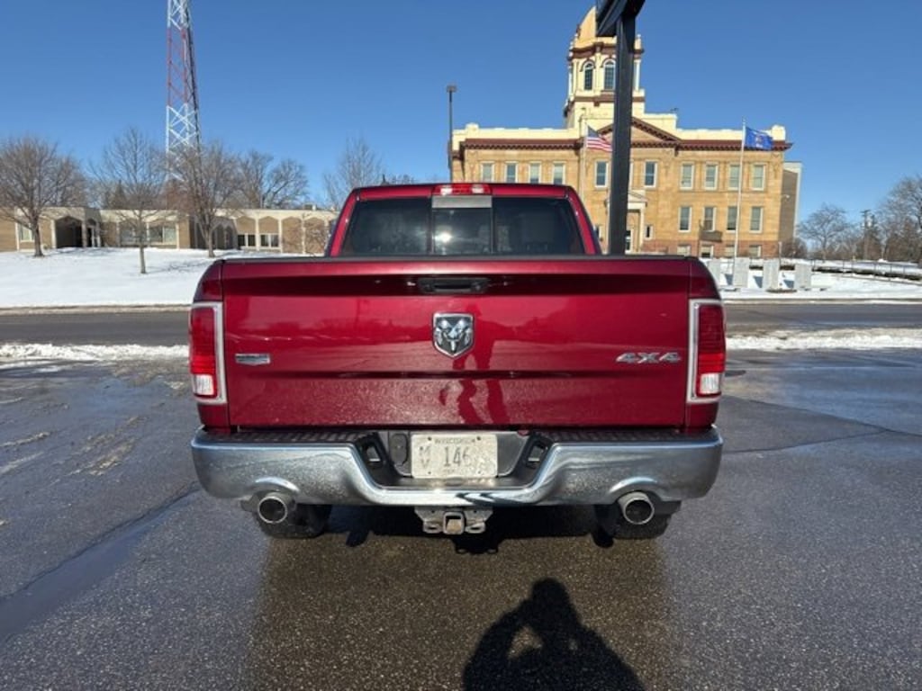 Quinn Motors of Ellsworth is pumped up to offer this attractive-looking 2017 Ram 1500 Laramie in Delmonico Red Pearlcoat, beautifully equipped with Convenience Group (Auto High Beam Headlamp Control, Keyless Enter-N-Go, Rain Sensitive Windshield Wipers, and Remote Proximity Keyless Entry), Quick Order Package 26H Laramie, 1500 Laramie, 4D Crew Cab, HEMI 5.7L V8 Multi Displacement VVT, 8-Speed Automatic, 4WD, Delmonico Red Pearlcoat, Black Leather, GPS Navigation, 1 Yr. Trial (Registration Required), 10 Speakers, 115V Auxiliary Power Outlet, 20 x 9 Chrome Clad Aluminum Wheels, 3.21 Rear Axle Ratio, 4-Wheel Disc Brakes, 5-Year SiriusXM Traffic Service, 5-Year SiriusXM Travel Link Service, 8.4 Touchscreen Display, ABS brakes, Active Grille Shutters, Adjustable pedals, Air Conditioning, Alloy wheels, AM/FM radio, Anti-Spin Differential Rear Axle, Audio Jack Input for Mobile Devices, Audio memory, Auto-dimming door mirrors, Auto-dimming Rear-View mirror, Automatic temperature control, Body Color Fender Flares, Brake assist, Bright Rotary Shifter, Bumpers: chrome, Center Hub, Compass, Delay-off headlights, Driver door bin, Driver vanity mirror, Dual front impact airbags, Dual front side impact airbags, Electronic Shift, Electronic Stability Control, Emergency communication system: Uconnect Access, Folding Flat Load Floor Storage, Front anti-roll bar, Front Center Armrest w/Storage, Front dual zone A/C, Front fog lights, Front reading lights, Front wheel independent suspension, Fully automatic headlights, Garage door transmitter, GPS Antenna Input, HD Radio, Heated door mirrors, Heated Front Seats, Heated front seats, Heated Steering Wheel, Heated steering wheel, High Back Seats, Illuminated entry, Integrated Voice Command w/Bluetooth, Leather steering wheel, Leather Trim 40/20/40 Bench Seat, LED Bed Lighting, Low tire pressure warning, Manufacturer's Statement of Origin, Media Hub (USB, AUX), Memory seat, Occupant sensing airbag, Outside temperature display, Overhead airbag, Overhead console, Panic alarm, ParkView Rear Back-Up Camera, Passenger door bin, Passenger vanity mirror, Pedal memory, Power 10-Way Memory Driver & 6-Way Passenger Seats, Power door mirrors, Power driver seat, Power passenger seat, Power steering, Power windows, Radio data system, Radio: Uconnect 3C Nav w/8.4 Display, Radio: Uconnect 3C w/8.4 Display, Rear 60/40 Split Folding Seat, Rear anti-roll bar, Rear seat center armrest, Rear step bumper, Rear Window Defroster, Remote keyless entry, Remote Start System, Remote USB Port, Security system, SIRIUSXM Satellite Radio, SIRIUSXM Traffic, SiriusXM Travel Link, Speed control, Split folding rear seat, Steering wheel mounted audio controls, Tachometer, Tilt steering wheel, Tip Start, Traction control, Trailer Brake Control, Trip computer, Turn signal indicator mirrors, Uconnect Access, Uconnect Access 1 Year Trial, Variably intermittent wipers, Ventilated Front Seats, Ventilated front seats, and Voltmeter. Backup Camera, 1500 Laramie, 4D Crew Cab, HEMI 5.7L V8 Multi Displacement VVT, 8-Speed Automatic, 4WD, Delmonico Red Pearlcoat, Black Leather, Auto High Beam Headlamp Control, Convenience Group, GPS Navigation, Keyless Enter-N-Go, Quick Order Package 26H Laramie, Rain Sensitive Windshield Wipers, Remote Proximity Keyless Entry. Priced below KBB Fair Purchase Price! Odometer is 15503 miles below market average!